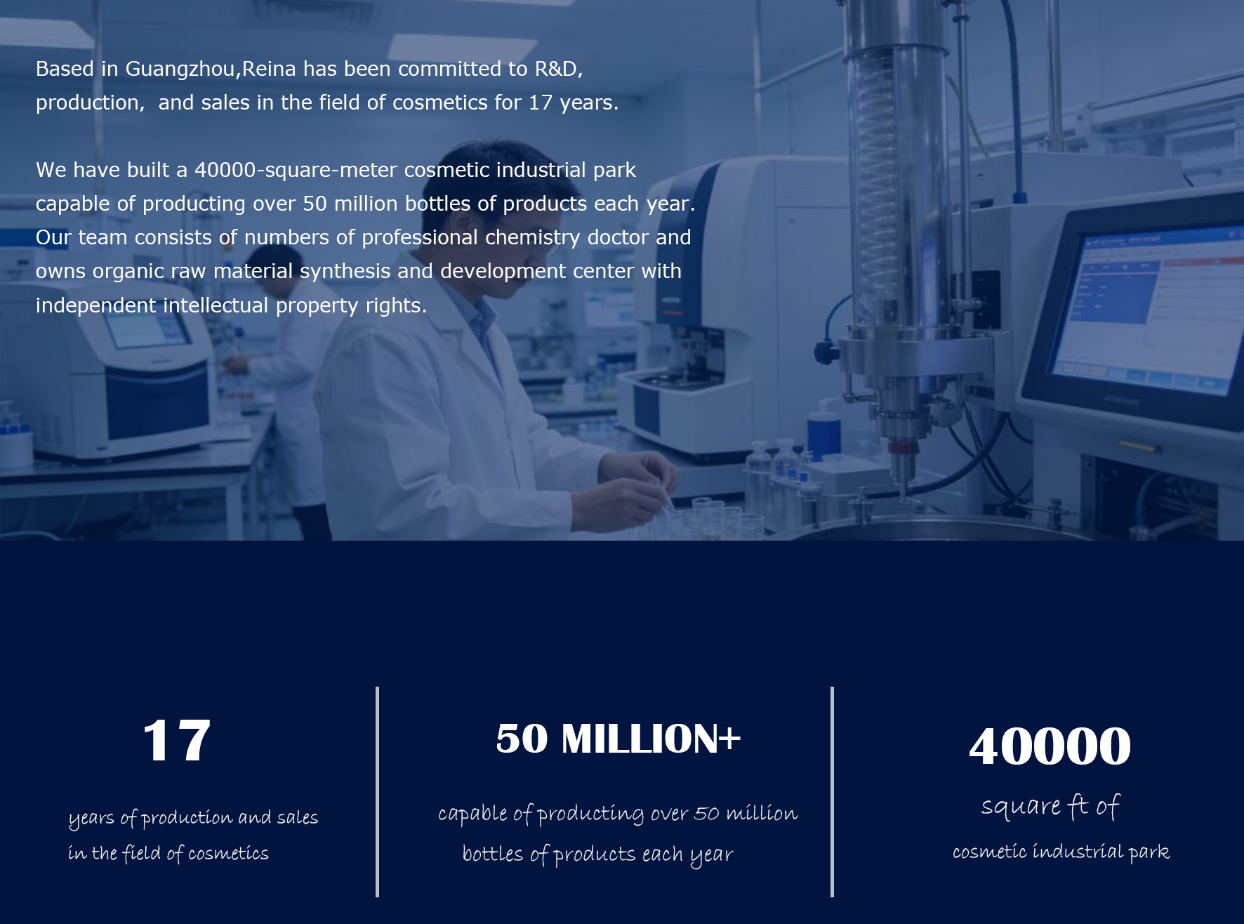 Based in Guangzhou,Reina has been committed to R&D,production,and sales in the field of cosmetics for 17 years.We have built a 40000-square-meter cosmetic industrial park capable of producting over 50 million bottles of products each year. Our team consists of numbers of professional chemistry docto